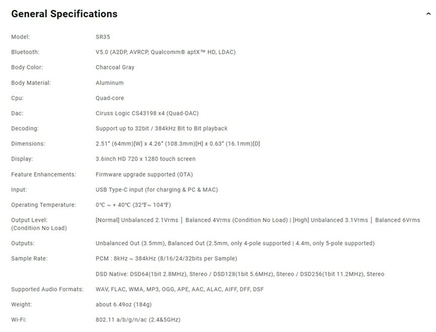 The SR35 provides premium-class audio specifications and genuineHi-Fi sound by Astell&Kern.