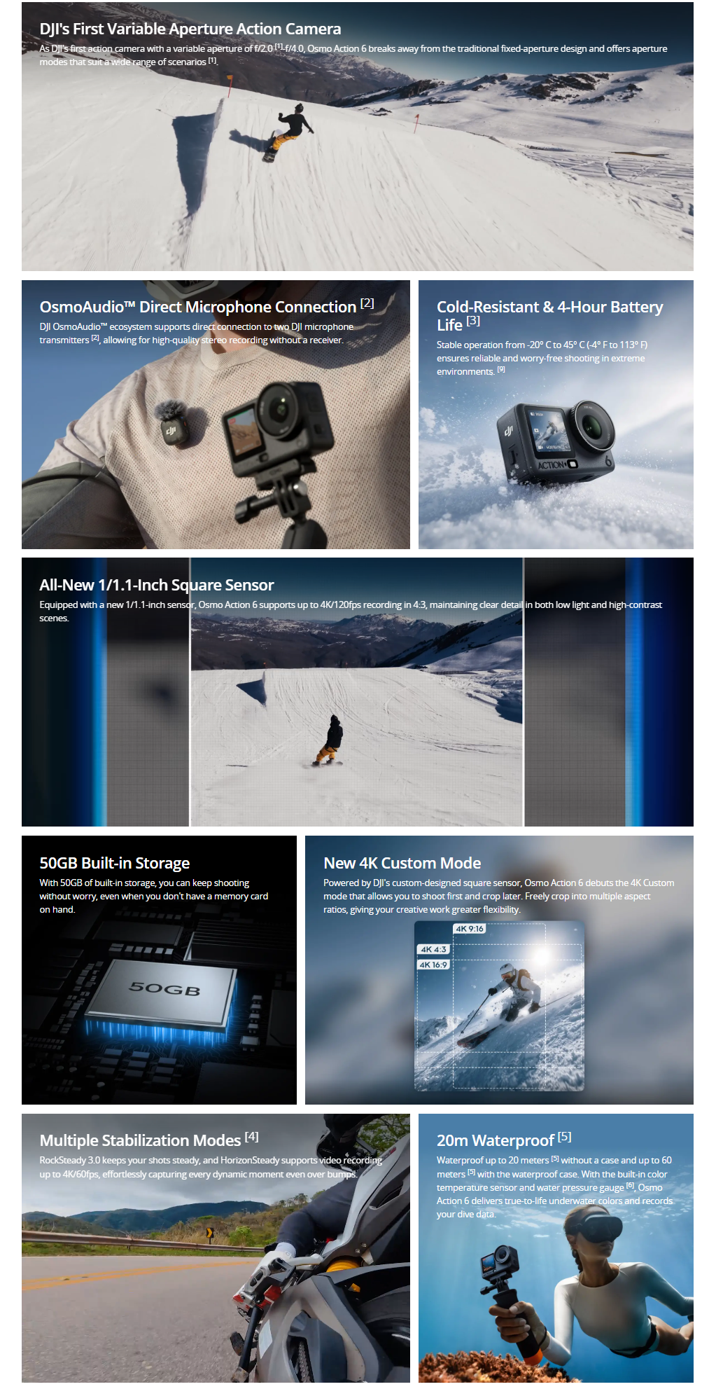 Action 6 unites an innovative variable aperture with an all-new 1/1.1-inch square sensor to redefine DJI flagship imaging and unlock more possibilities for creative shooting.