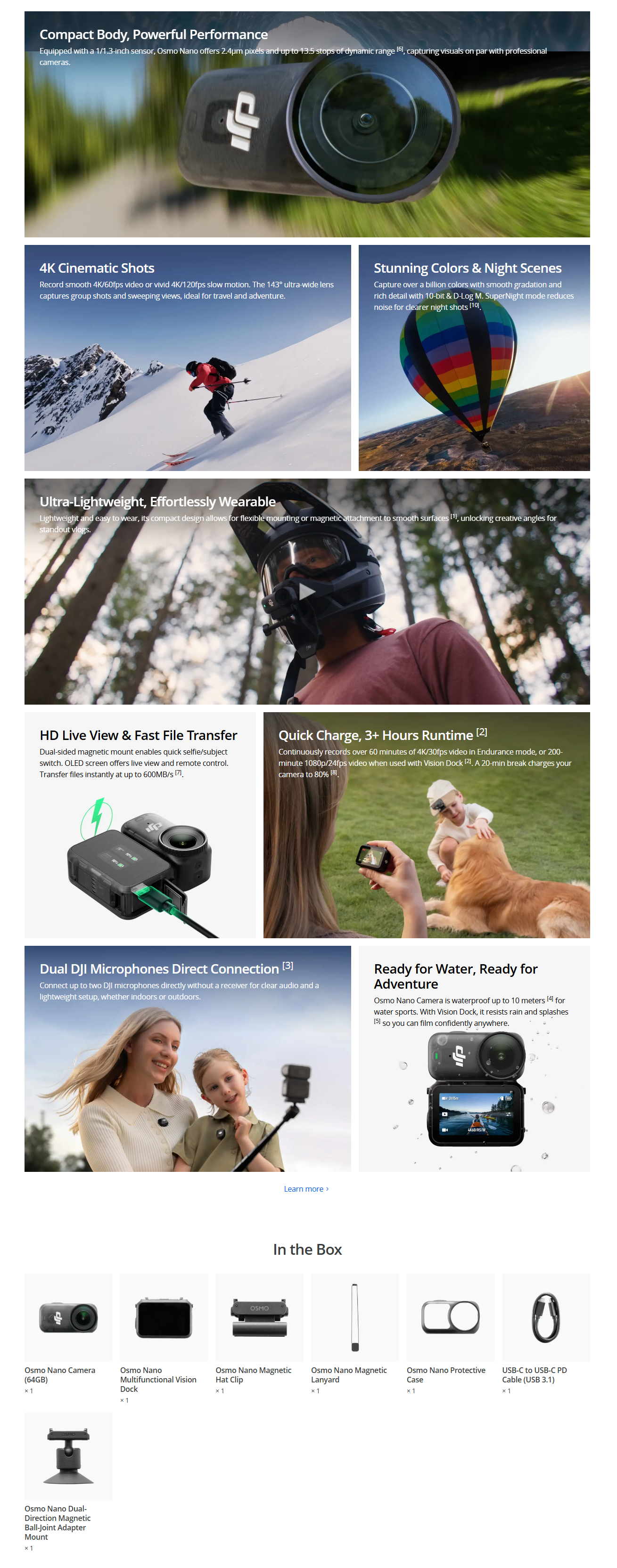 Lightweight and ready for anything, Osmo Nano lets you capture life’s moments effortlessly, wherever your day takes you. From cycling and running to epic adventures and everyday moments, Osmo Nano delivers crisp, vivid footage that brings every memory to life. Its sleek, magnetic design unlocks bold, new, hands-free shooting angles, helping you tell your story like never before.