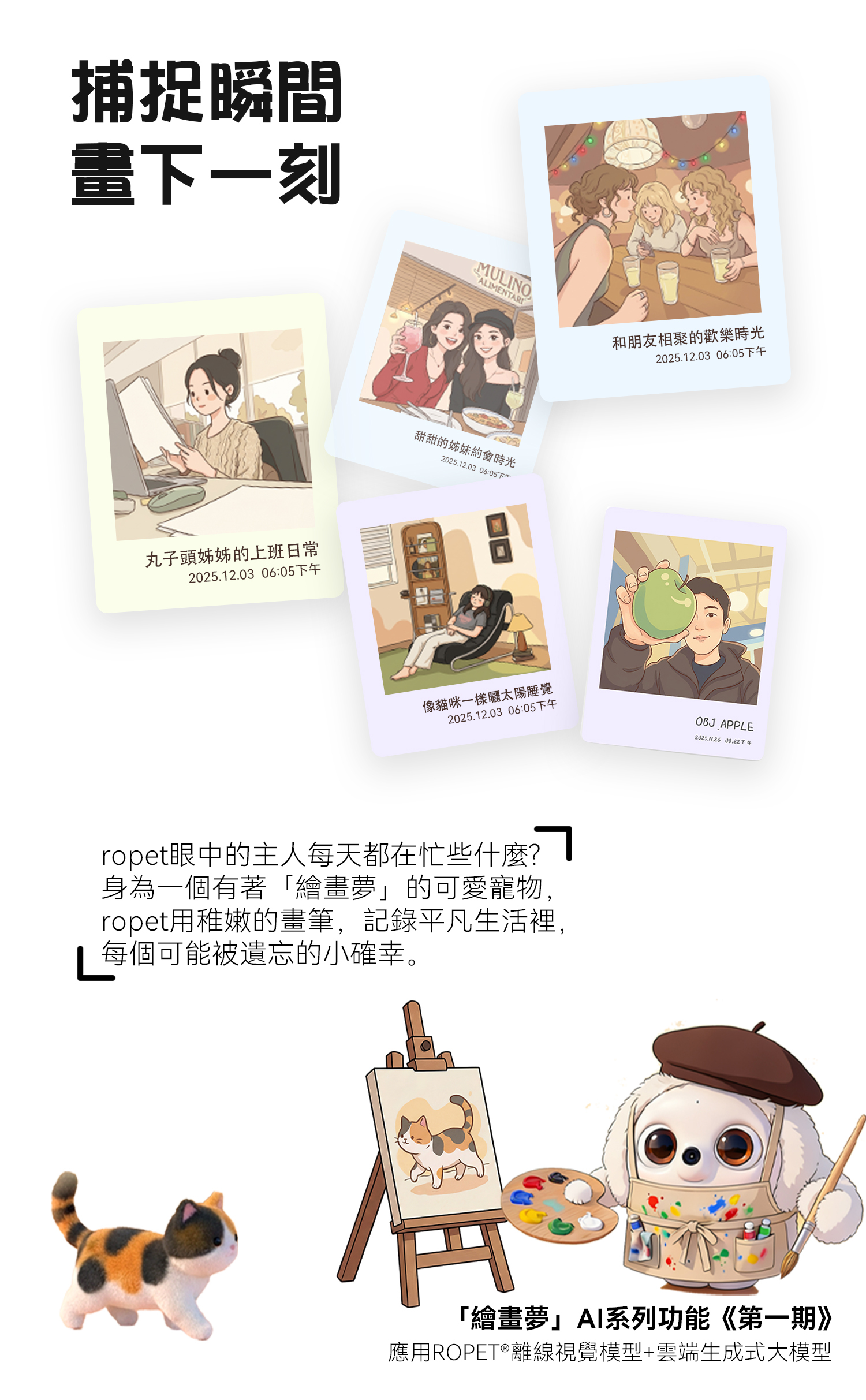 Ropet 專為「慢陪伴」設計。它內建多種互動模式,能夠隨著音樂輕輕律動,或進行簡單的桌面互動。它透過日常互動學習成長,培養獨特個性,成為您桌面上一位安靜的夥伴。