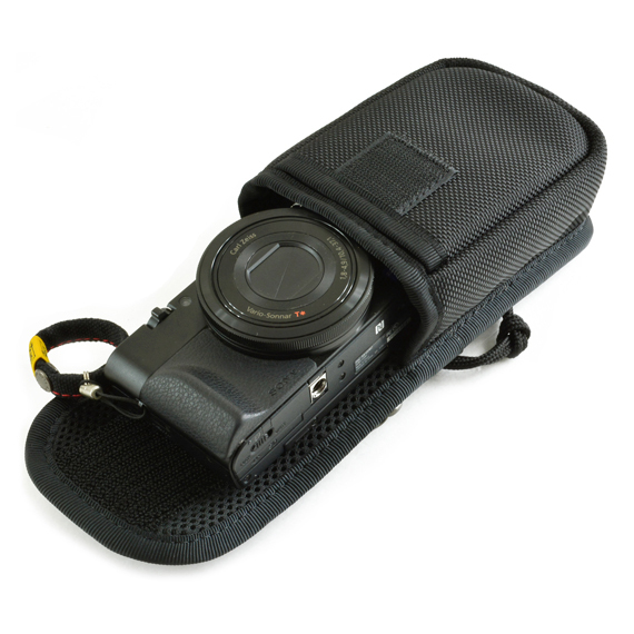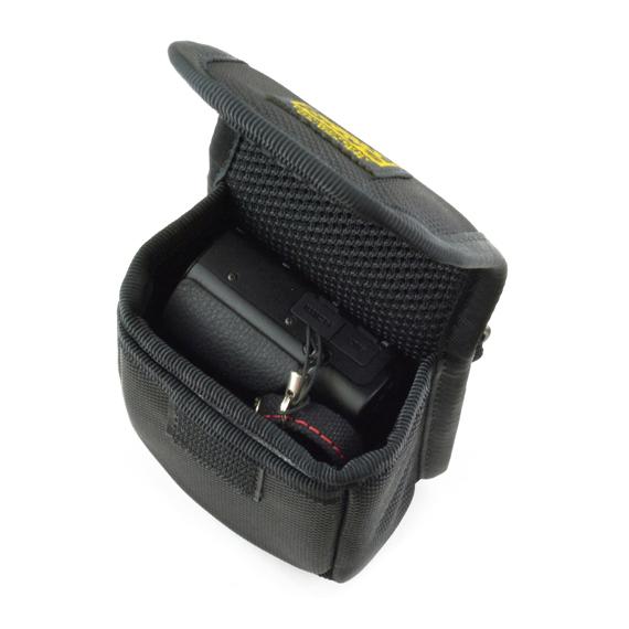 This is a half-flap vertical carrying bag designed to store the Sony Cyber-Shot RX100 series lightweight digital cameras. The main body is made of double-layer polymer mesh material, providing excellent cushioning. Additionally, by inserting cards or other items into the front pocket of the camera body, the automatically opening and closing lens cover is protected from accidental external pressure. There is also a pocket on the back of the bag for storing spare SD cards and batteries. The back features a vertical strap and ring, allowing it to be securely attached to the waist, making it a versatile vertical carrying case that can be carried in multiple ways depending on the situation.