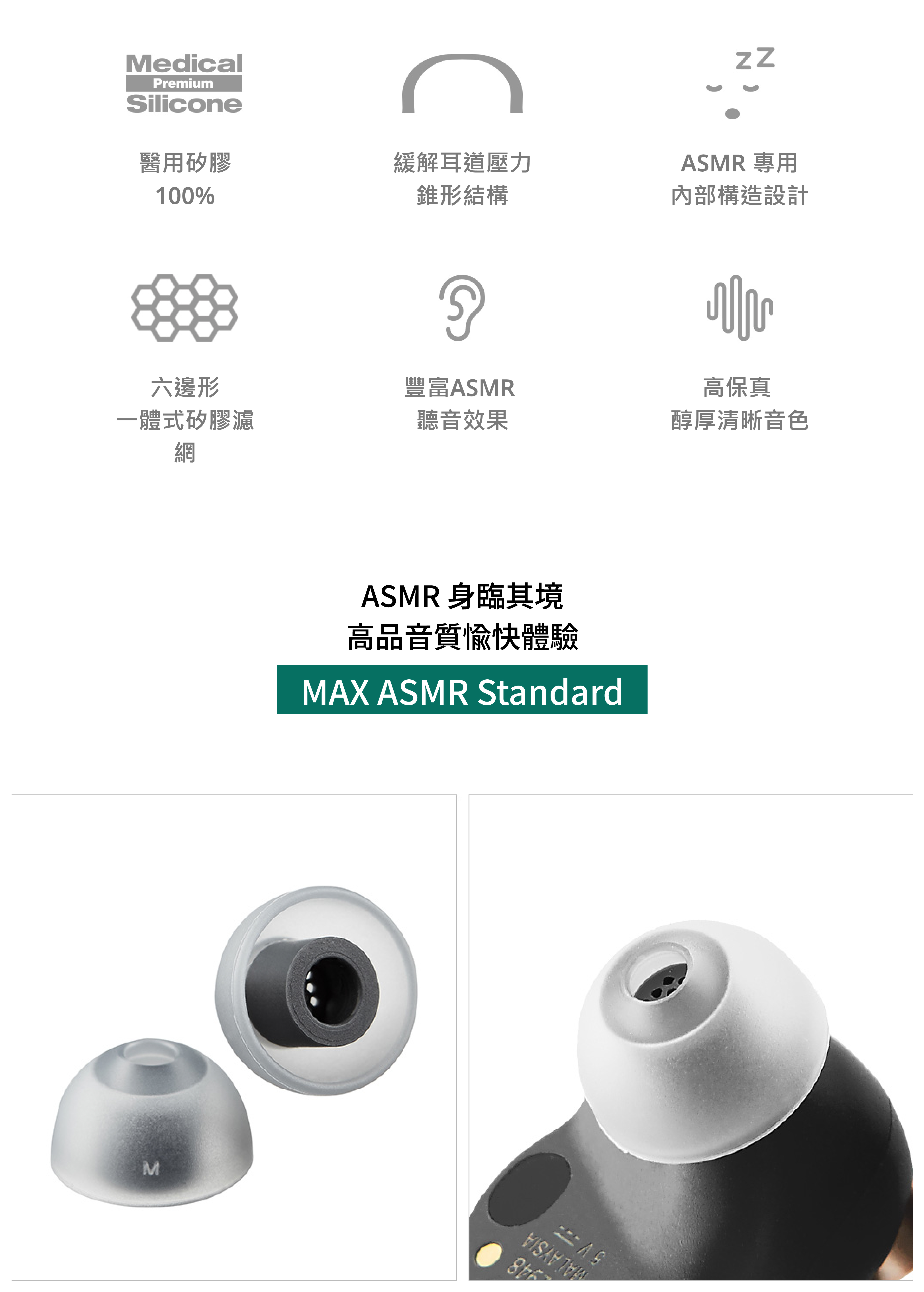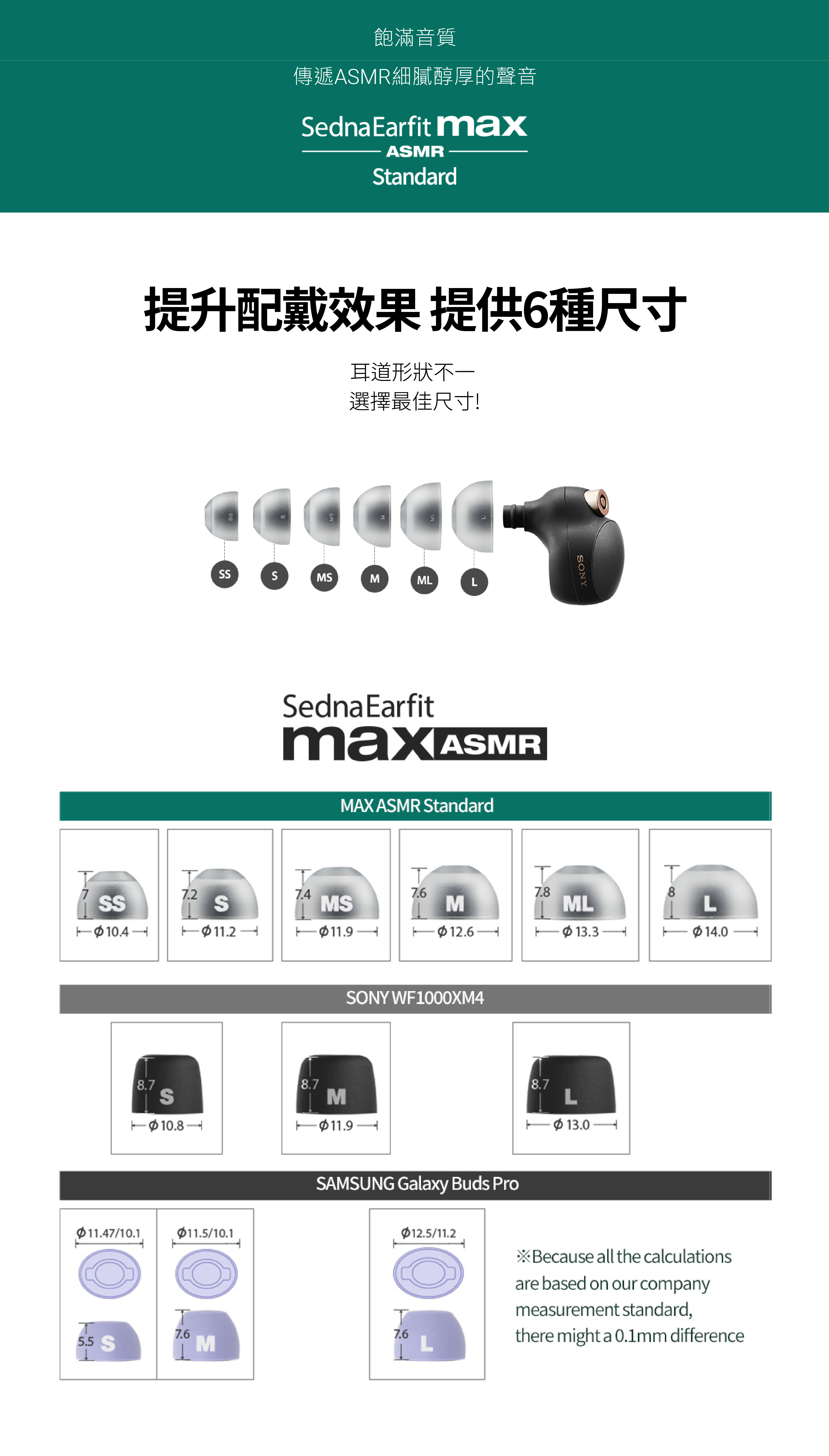 SednaEarfit MAX ASMR 耳膠合適市面大部份粗管及粗短管入耳式及真無線耳機,亦保留附送幼導管耳機用的轉換器,非常方便,耳膠尺寸方面更有 6 個可供選擇包括:SS, S, MS, M, ML, ML, L