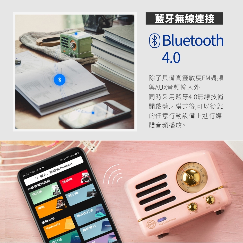 ● 功能:Bluetooth,FM收音機,AUX功能 (3UV)