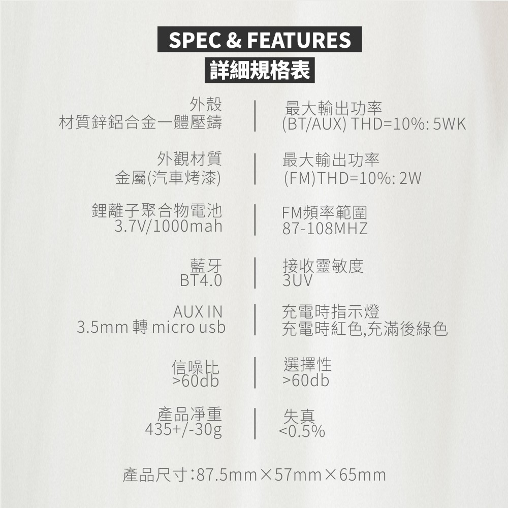 ● 最大功率輸出:5W/藍牙,2W/FM 收音機